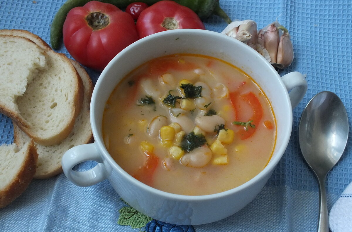 Нам понадобится: перец болгарский (лучше красный или желтый) — 1 шт., помидор – 2 небольших, лук репчатый — 1 шт., фасоль консервированная (белая) — 1 банка, чеснок — 4 зубчика, кукуруза консервированная — ½ банки, бульон (овощной, куриный или просто вода) — 1 л, масло оливковое — 2 ст. л., сливки — 3 ст.л., соль и перец по вкусу, петрушка или укроп.