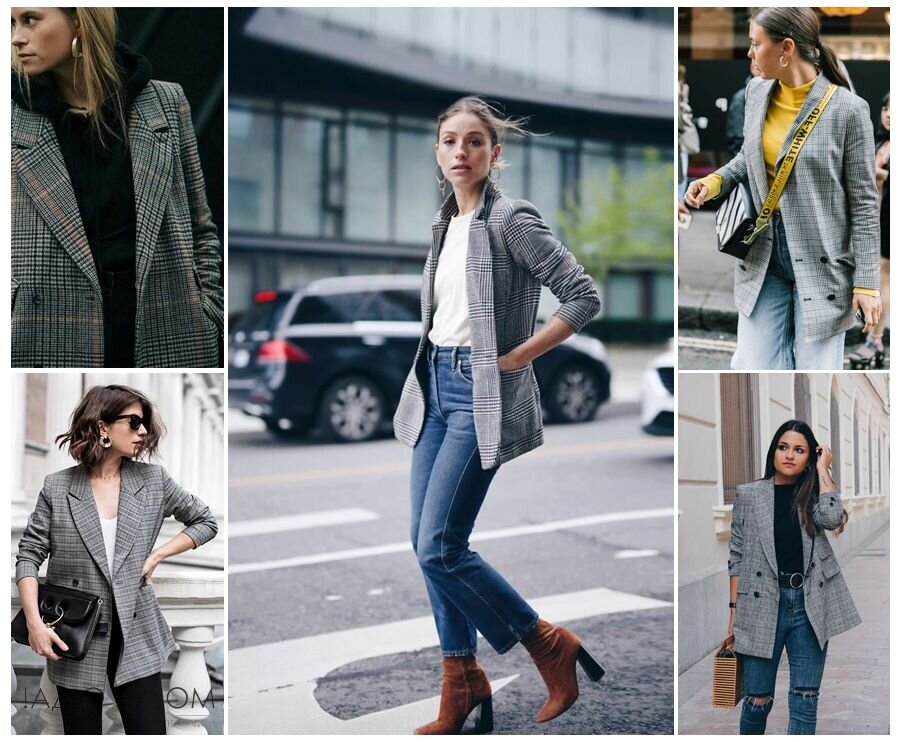Жакет, как показывают тенденции последнего сезона, – вещь универсальная. Теперь ему отведена не просто планктонно-офисная роль, сегодня жакет (блейзер) стал завсегдатаем уличного лука и вовлекается в создание образов совершенно футуристических или по-домашнему спокойных. Стилисты вышли за рамки дозволенного и предлагают объединять блейзеры в образах по мотивам современных хроник мегаполиса. С кедами и кроссовками С парой спортивной обуви теперь носят всё что угодно по нескольким причинам – это удобно, практично, модно. Сочетание жакета с кроссовками или кедами - не новьё, но по-прежнему остаётся в тренде. С кроссовками garbage-стиля удачно объединяют жакеты прямого силуэта и даже приталенную классику. С платьем- Casual Актуальным решением станет объединение жакета не с просто повседневным платьем, а с платьем-халатом. Длину платья можно варьировать от ультракороткой в сочетании с блейзером намного длиннее платья, или остановить свой выбор на длинном платье-халате до щиколотки, но жак