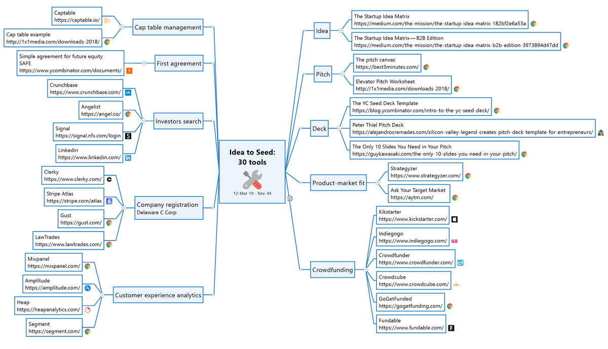 Представляем карту инструментов развития компании: от идеи до посевного инвестиционного раунда. Большая часть карты создана на основе двух статей ноября 2018, Антона Гладкобородова “Пошаговая инструкция: как привлечь в компанию средства от американских инвесторов” и Михаила Меланьина “Как поднять деньги в Долине за 21 день“, а также лекций Y Combinator Startup School “Юридическая механика стартапа” и “Финансовая механика стартапа” – в переводом онлайн школы стартапов http://russol.info/. Перед использованием карты лучше прочитать эти статьи и посмотреть видео. Направления и инструменты для каждого из направлений: idea, pitch, deck, product-market fit, crowdfunding, customer experience analysis, company registration, investors search, first agreement, cap table management. В каждом – 2-6 инструментов со ссылками. Карта в облаке: https://share.mindmanager.com/#publish/XNnfl_9JpKpMfP_S0ZhRwbTTxsTVo2rMyaM3PZLt Карта в PDF: https://drive.google.com/open?id=1yjlHC30cmre4_JuISVsNIAoT550wWL