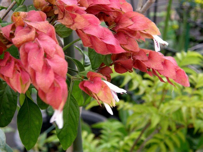 Необычный и красивый кустарник еще называют комнатным хмелем или раковой шейкой из-за того, что соцветия растения напоминают длинные шишки хмеля или креветку. Несложный уход в домашних условиях за белопероне и круглогодичное цветение сделали это красивое вечнозеленое растение, которое может быть отличным украшением жилища или офиса, популярным. Цветок любит чистый воздух и солнце, но не палящее прямыми лучами. Чтобы правильно ухаживать за комнатными растениями белопероне, следует знать некоторые правила. Посадка/выращивание Комнатный цветок белопероне может расти в универсальном грунте, но лучше приготовить для него почвосмесь такого состава: на 2 части дернового и листового субстрата добавить по одной части перегноя, а также торфа и песка. Посадку осуществляют укорененными черенками или саженцами, проросшими из семян. С начала весны и до середины осени каждую неделю нужно регулярно подкармливать растение минеральными веществами. Если зимой не удалось создать правильный температур