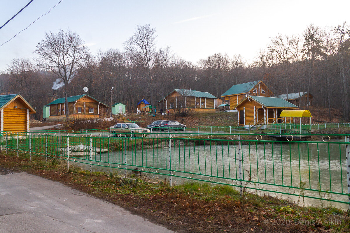 Осенью, при подъезде солнечной поляне открывается вот такой вид на часть территории комплекса, где видны гостевые домики.