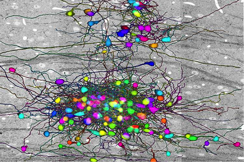 Откройте любую книгу по биологии и без труда узнаете, что таламус — это область мозга, в основном работающая как ретранслятор, который передаёт сенсорную информацию отовсюду (кроме обоняния) на обработку в кору (подробнее об этом участке мозга можно прочитать в нашей специальной статье). Однако когда несколько исследователей из Гарварда присмотрелись к «началу пути» этой ретрансляции – связям между сетчаткой и таламусом, — они обнаружили кое-что интересное. А результаты исследования опубликованы в журнале Cell. Нейронная цепь в зрительной области таламуса мыши. На фоне 100-терабайтного черно-белого массива данных электронной микроскопии цветом выделены сотни нейронов, связанных между собой в сложную сеть. Джефф Лихтман (Jeff Lichtman), занимающий профессорскую должность имени Джереми Ноула по молекулярной и клеточной биологии и профессорскую должность по искусствам и науке имени Сантьяго Рамон-и-Кахаля, а также его постдокторант Джошуа Морган (Joshua Morgan) на примере детализирован