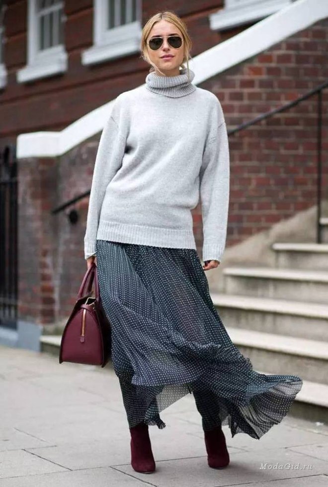 Наверняка в каждом гардеробе найдется летнее летящее платье или длинная юбка из шифона. Именно с ними стилисты рекомендуют сочетать длинный джемпер, чтобы выглядеть стильно этой осенью. Стильным получится look c подвернутыми рукавами, сапогами с высоким голенищем или ботинками на плоском ходу. Джемпер можно приталить грубым кожаным ремнем.