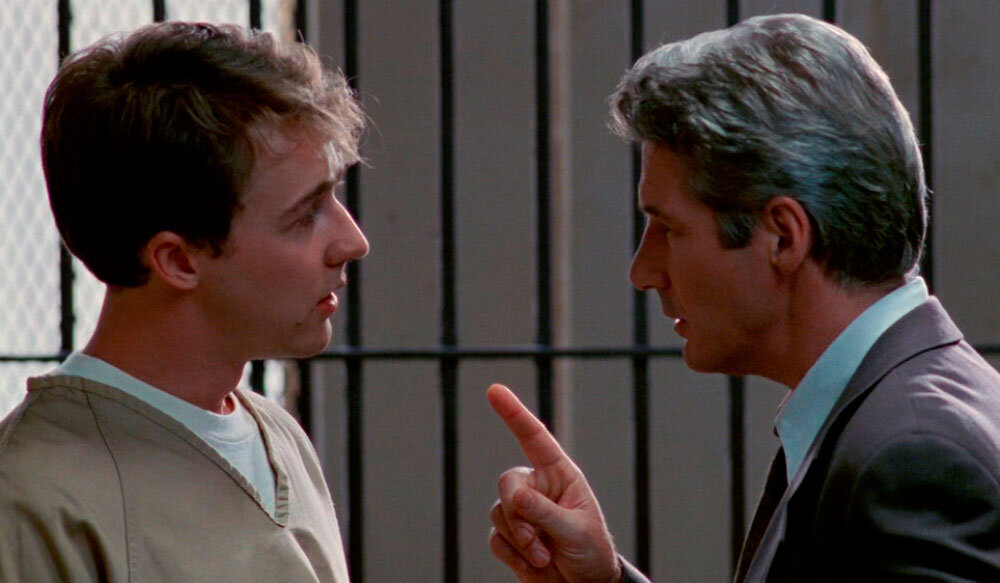 Дебютная работа Эдварда Нортона - в отсросюжетном триллере "Первобытный страх" 1996 года, где главную роль сыграл знаменитый Ричард Гир. Примечательно, что картина осталась в числе 30 лидеров кинопроката. Эдвард Нортон сыграл обвиняемого, которого арестовали на месте преступления. Ричард Гир выступил в качестве его адвоката. Мартин Вейл (Ричард Гир) - успешный адвокат, который сам решает, за какое дело ему браться. И вот - очередной шанс спасти от смертной казни молодого парня, в чьей невиновности он уверен абсолютно. Испуганного подростка Аорона Стэмплера (Эдварда Нортона) находят при не самых благоприятных для него обстоятельствах - жестокое убийство священослужителя архиепископа Рашмена. Актерское мастерство Эдварда оценили по достоинству. В 1997 году актер за лучшую мужскую роль второго плана удостоен "Золотого глобуса", а также был номинирован на четыре премии, включая и "Оскар". Ричард Гир же затрагивает проблему отношения к адвокатам. Их считают продажными ш** (ночными бабоч