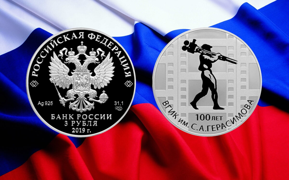 Банк России 28 августа 2019 года выпускает в обращение памятную серебряную монету номиналом 3 рубля «100-летие Всероссийского государственного института кинематографии имени С.А. Герасимова» (каталожный № 5111-0407). Монета (масса драгоценного металла в чистоте — 31,1 г, проба сплава — 925) имеет форму круга диаметром 39,0 мм. С лицевой и оборотной сторон монеты по окружности имеется выступающий кант. На лицевой стороне монеты расположено рельефное изображение Государственного герба Российской Федерации, имеются надписи: «РОССИЙСКАЯ ФЕДЕРАЦИЯ», «БАНК РОССИИ», номинал монеты — «3 РУБЛЯ», дата − «2019 г.», обозначение металла по Периодической системе элементов Д.И. Менделеева, проба сплава, товарный знак Санкт-Петербургского монетного двора и масса драгоценного металла в чистоте.