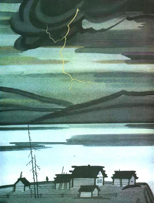 В книге Валентина Распутина Ангара — воплощение первозданной природы, мощная и своенравная, грозная и прекрасная, как древняя богиня. В сознании маленького героя она живая: «Река беспокойно возилась, покачивалась, вздыхала. Порой изнутри доходил глухой, утробный шум, затем раздавался быстрый и сильный, как выстрел, треск, и по льду вспыхивали трещины». Когда находит гроза, «посторонняя властная сила» заставляет мальчика выйти из дома и смотреть на то прекрасное и ужасное действо, которое разворачивается перед ним. Он захвачен вихрем этой стихии, он часть чего-то очень большого и настоящего, и от этого и страшно, и хорошо на душе. Деревянные домики выглядят маленькими и беззащитными рядом с широким потоком реки, над ними нависают скалы, деревню обступает высокий сосновый лес. Человек на иллюстрациях Багина — совсем не царь природы, а маленький муравьишка, но только детям и старикам дано это почувствовать. Не каждый может заметить, как гудит и шумит от своих жителей тайга, как шуршат