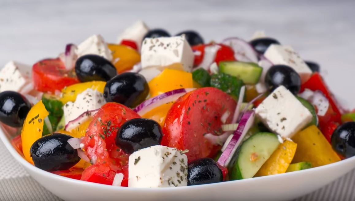 Сегодня мы приготовим очень легкий и простой греческий салат. В Греции этот салат называют деревенским так как этот салат очень лёгкий в приготовление И для него всегда есть доступные продукты! ИНГРЕДИЕНТЫ: 5 свежих огурцов небольшого размера; 3 свежих помидора; 1 болгарский сладкий перец; 1/2 красного лука; 10-15 маслин без косточки; 100-150 г сыра Фета (Брынза); 1-2 зубчика чеснока; 1 ч. л. соли; 1 ст. л. лимонного сока или винного уксуса; 4 ст. л. оливкового масла Extra Virgin; 1/2 ч. л. молотого черного перца; 1/2 ч. л. сушенного орегано (душицы или майорана). И так что же нам понадобится для приготовления такого салата, болгарский перец, помидоры, огурцы, лук, приблизительно для такого количества овощей нам понадобится 150 г сыра Фета, так же нам нужны будут оливки, а для заправки нам нужно лимонный сок, чеснок, соль, орегано, оливковое масло и черный молотый перец, приготовление салата начинаем с нарезке овощей все овощи для салата нарезаются крупными кусками, огурцы отрезаем
