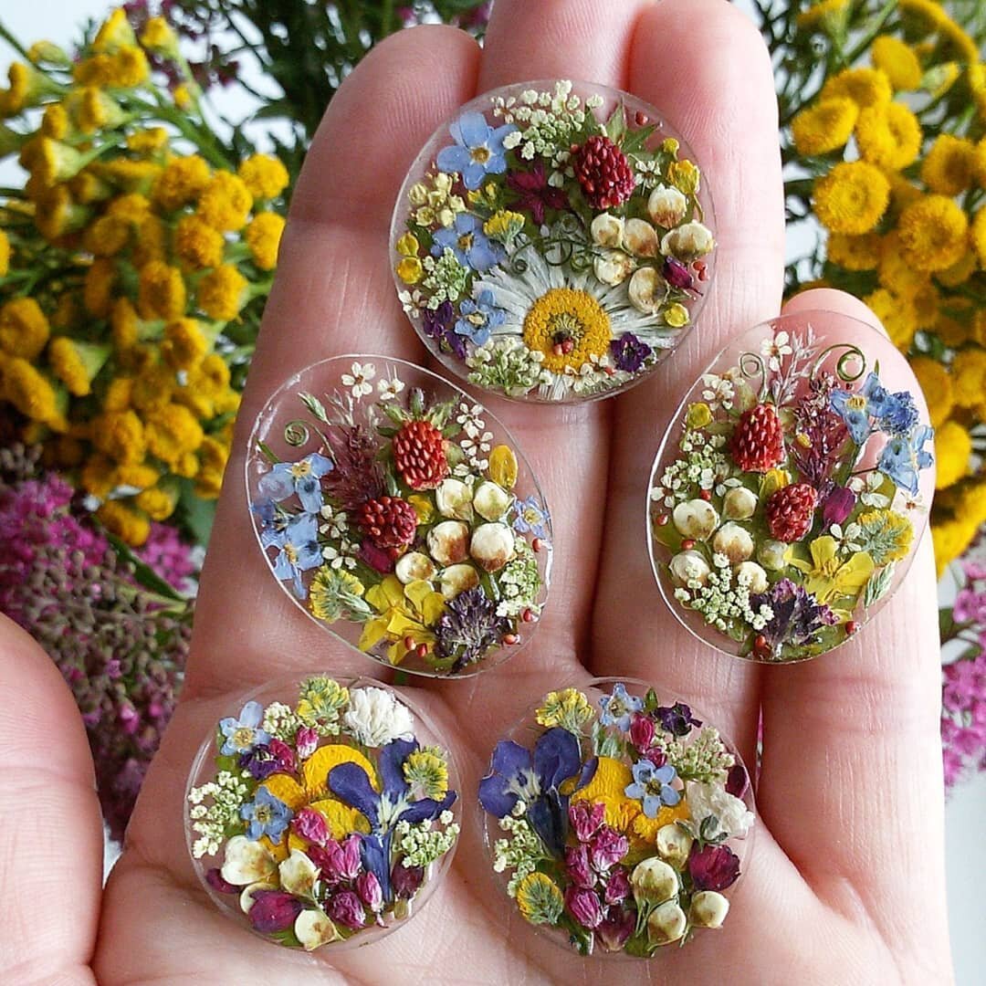 Например, чтобы создать украшение, достаточно взять форму, наполнить ее наполовину эпоксидной смолой, добавить предметы – ракушки, сухоцветы, цветы, насекомых, блестки, затем залить до краев формы и подождать 24 часа для застывания. После снять заготовку из формы, отполировать поверхность и использовать ее для изделия (прикрепить фурнитуру и остальные элементы).