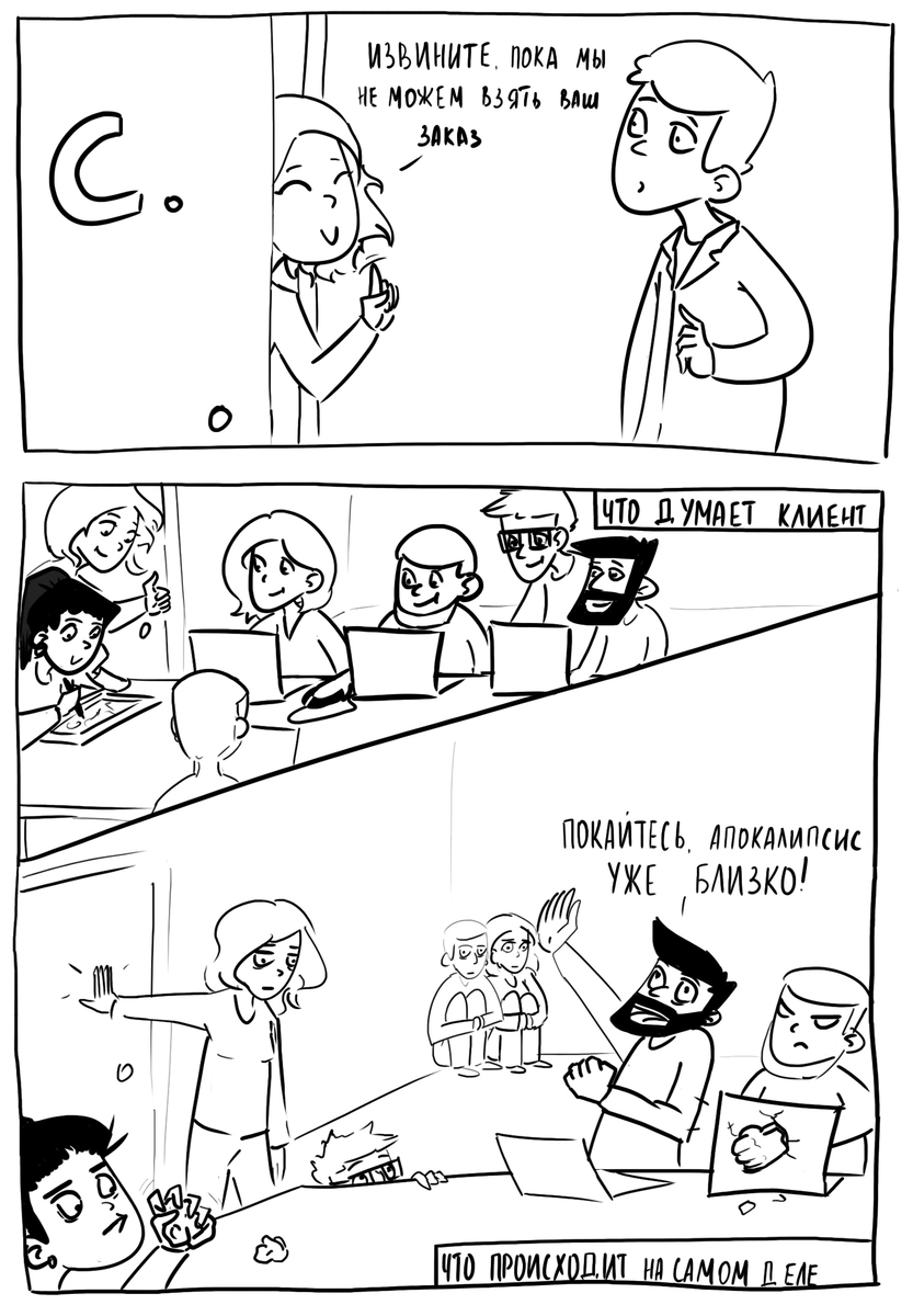 Статья-мантра, статья-мудрость. Всмотритесь в его глубины, темные и бездонные, как мозги человека, который: «Ребят, я знаю, что половина одиннадцатого, но тут надо статейку. Завтра публикуем, уже оплатили размещение!» Привет, меня зовут Алексей. Если вы первый раз получаете наше письмо, я отвечаю в «Сделаем» за то, чтобы все делалось, даже если для этого нет сил, средств и желания. Пока команда зашивается (на самом деле большая часть таскает свои шмотки в попытках улучшить жилищные условия) я расскажу о том, что сейчас делается за кулисами нашего производства и дам пару советов, которые стоили нам значительного количества нервных клеток. Поймал себя на мысли, что последние две недели вокруг все пылает, но, что странно, никто пока не умер и ни одного срока мы не сорвали. Удивительно, конечно, но ничего не ломается. Скорее всего, потому что: 1. Мы задаем нереальное количество вопросов Как срочно надо? А кто будет принимать? А как с ними связаться? А когда это можно сделать? А что будет,