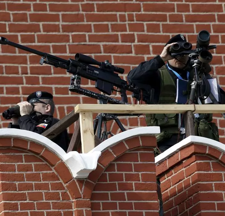 Наверняка, большинство из вас понимает, что для обеспечения безопасности во время проведения культурно - массовых мероприятий, усилий одной только полиции недостаточно. В связи с этим неудивительно, что с самого начала военного парада 9 мая на кремлёвских стенах и башнях свои позиции заняли специалисты ФСО со снайперскими винтовками. Основной целью снайперов на кремлёвских стенах является мониторинг окружающей обстановки, и моментальная реакция на любой вид угрозы. Безусловно, открывать огонь на дистанции более 1 километра будут лишь в самом крайнем случае. В то же время, снайперские винтовки Т-5000 от отечественной компании Ортис, которые стоят на вооружении всех российских спецслужб, без особых проблем справятся с этой задачей. Спросить непосредственно у самих снайперов, кого же они действительно охраняют у вас вряд ли получиться. При попытке вскарабкаться на стену Кремля у вас могут возникнуть серьёзные проблемы, вплоть до пулевых ранений. В случае обнаружения беспилотных летатель