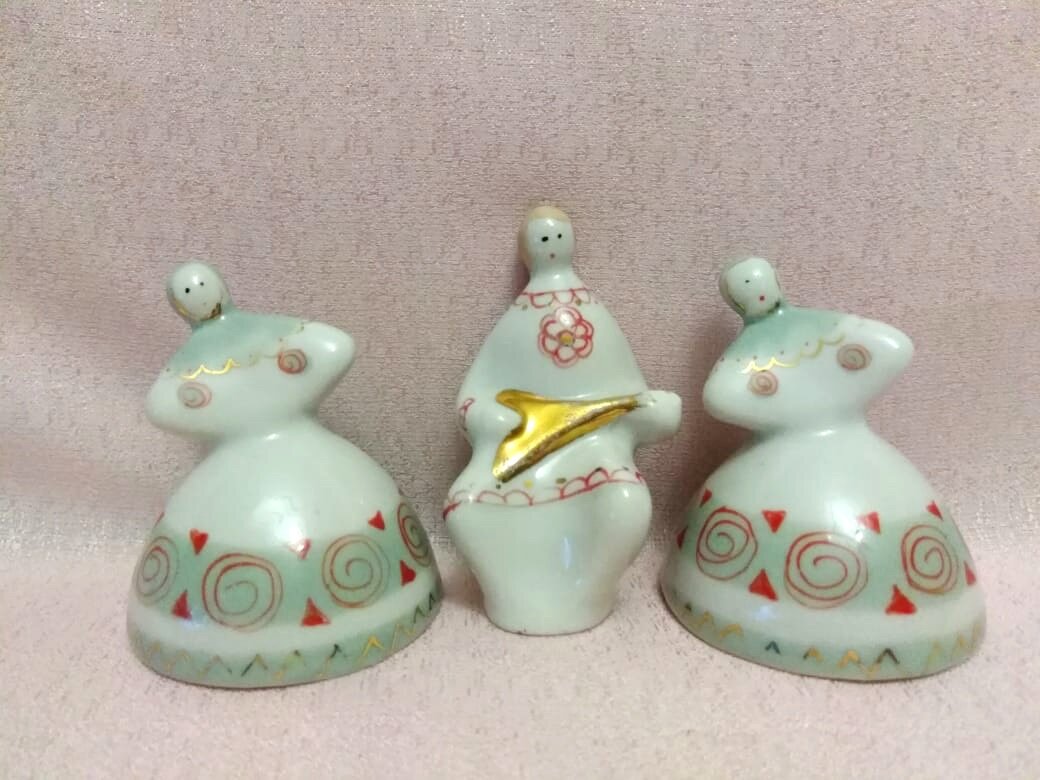 Еще три миниатюрки - балалаечник и две барышни-плясуньи. Высота у мальчика 7 см, а у девушек - по 6 см, клеймо надглазурное, ставилось с конца 1960-х до 1970 года. Выпускались они на Бронницком заводе фарфоровых изделий «Возрождение». Находилось это предприятие в г. Бронница, в 25 км от Новгорода. Фигуры повторяют сугубо новгородские мотивы, основываясь на древнерусских традициях. Если посмотреть на роспись их нарядов - традиционные геометрические элементы. Роспись ручная, очень-очень скромная. Даже лица – это просто три точки. Не могу сказать, что очень они мне нравятся, просто люблю миниатюрные скульптурки и, если попадаются, то стараюсь их приобретать. А то заводы большей частью закрываются и уносят с собой огромный пласт истории и традиций.