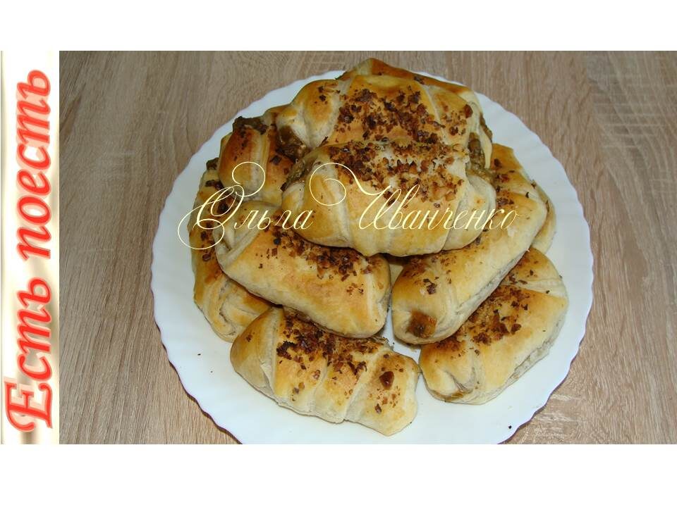 Необычное сочетание слоёного теста и баклажанов. Получается очень вкусно! Особую нежность придаёт сыр, входящий в состав начинки. А орехи дополняют великолепный вкус этой выпечки. Ингредиенты: Баклажаны очистить от кожицы и порезать мелкими кубиками. Так же порезать лук, чеснок пропустить через пресс. Обжарить овощи на растительном масле, в конце посолить и добавить сметану. Положить тёртый сыр и нарезанную зелень. Остудить. Начинка готова. Тесто подготовить к работе по инструкции на упаковке. Разрезать на треугольники. Положить начинку и сформировать рогалики. Противень выложить пергаментом, который смазать маслом. Положить рогалики, смазать их молоком или желтком и посыпать измельченными орехами. Выпекать при 180-190 градусах - 15-20 минут.