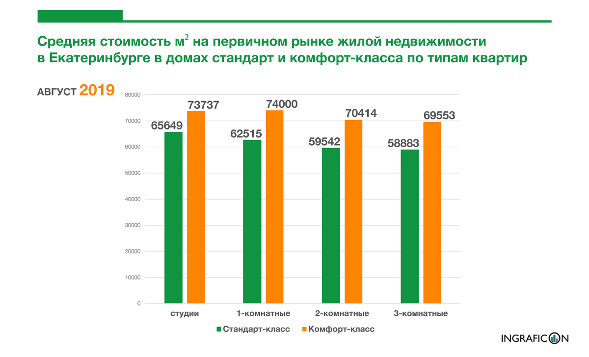 Средняя стоимость квадратного метра в Екатеринбурге в домах стандартного класса, комфорт-класса и бизнес-класса значительно отличается. Так, например, средняя стоимость квадратного метра в жилых комплексах стандарт-класса – 61 647 рублей, это на 15 % ниже, чем средняя стоимость квадратного метра в новостройках комфорт-класса – 70 587 рублей и практически на 42% меньше, чем в домах «бизнес» — 106 469 рублей.