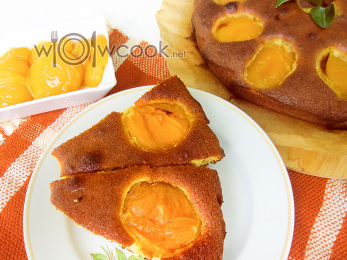7. Выпекаем пирог с консервированными абрикосами при температуре 180 градусов около 30-35 минут, время зависит от высоты формы. Готовность проверяем деревянной палочкой, на ней не должны остаться я следы жидкого теста. Горячий абрикосовый пирог пропитываем фруктовым соком или смазываем сливочным маслом, затем остужаем на решетке.