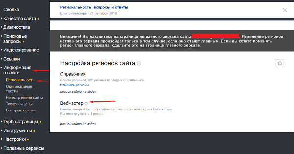 Для того, чтобы сайт лучше ранжировался в целевых регионах потребуется указать региональность в Яндекс.Вебмастере. Через Яндекс.Вебмастер Для того, чтобы задать региональность в Яндекс.Вебмастере потребуется добавить сайт в сервис, после чего посетить раздел «Информация о сайте»-«Региональность». После этого в вкладке «Вебмастер» нажимаем на «шестеренку». Далее нажимаем на «Добавить регион» и вводим населенный пункт или город, например, Москва. После вводим ссылку на страницу, подтверждающую адрес расположение организации, например, контакты и нажимаем на «Сохранить». Теперь заявка отправлена и в течение 7 дней сайту будет задана региональность. Через Яндекс.Справочник Для того, чтобы задать региональность также можно использовать Яндекс.Справочник, для чего достаточно добавить сайт и организацию на карты. Проверить данный факт можно посетить Яндекс.Вебмастер. В этом случае указанный на картах регион (город или населенный пункт) будет указан как основной. Если компания и сайт работаю
