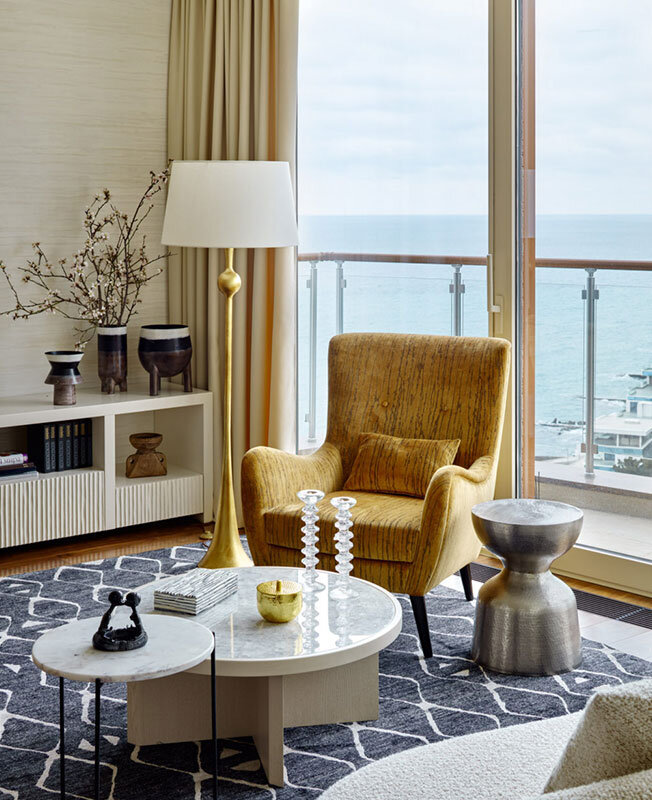 Наталья Попова и Дарья Синотто создали в геометрически сложном пространстве утонченный интерьер с природными формами и палитрой, повторяющими живописный вид из окна на море. По теме: Наталья Попова и Дарья Синотто: объединение двух квартир Квартира в Ялте 75 кв. метров предназначена для временного проживания — владельцы приезжают сюда для отдыха. Дизайнеры в первую очередь сосредоточились на эстетичной картинке, а после — на функциональности. Главным достоинством квартиры стало панорамное остекление и впечатляющий вид на море. Наталья и Дарья решили поддержать морскую тематику, но крайне осторожно, без перегибов. В интерьере преобладают песочные и золотистые оттенки, керамические панно на кухне и в прихожей ссылаются на форму морских ракушек, в спальне появляется нежный коралловый цвет и др. Просторная общая зона включает гостиную, кухню, столовую. Единственным изолированным помещением в квартире стала спальня. Дизайнерам достался и многоуровневый потолок. Чтобы сгладить перепады