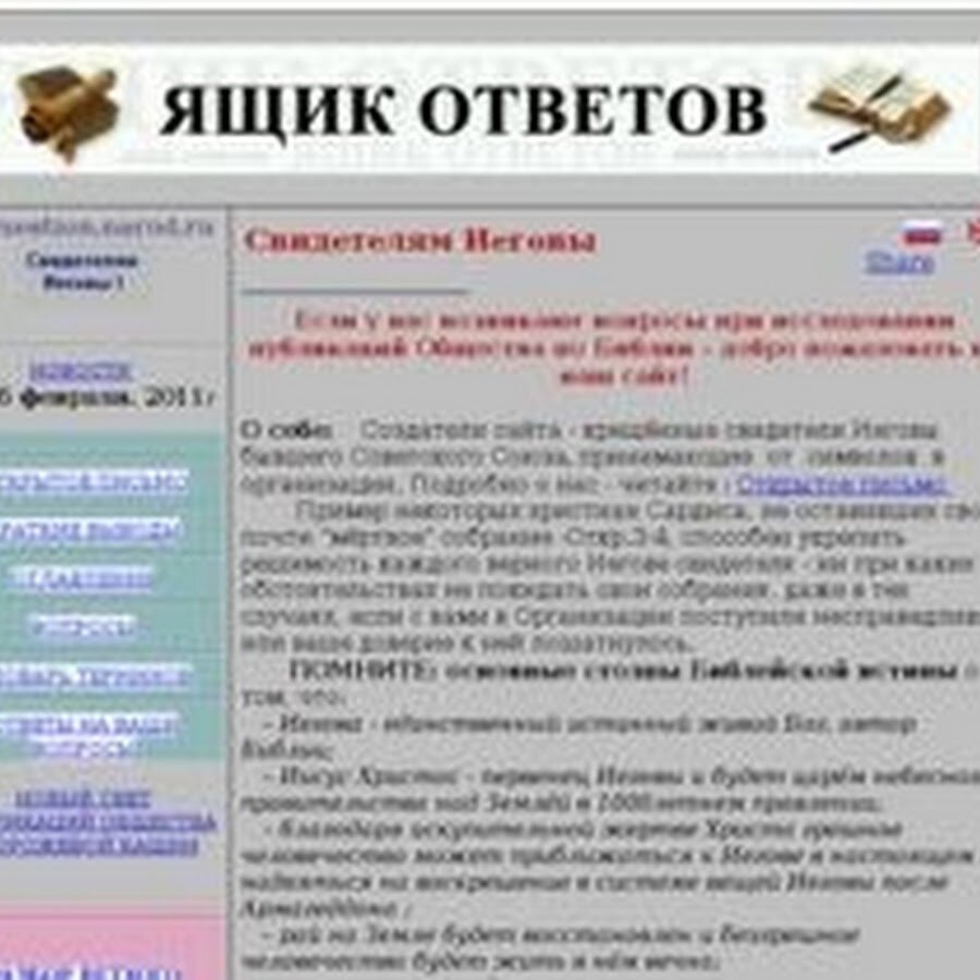 Много лет назад я и мои друзья натолкнулись на сайт под любопытным названием "ЯЩИК ОТВЕТОВ. СВИДЕТЕЛЯМ ИЕГОВЫ". Для тех кто не знает, одна из рубрик специальной инструкции "Наше царственное служение" о том. кому и каким способом следует проповедовать в том или ином месяце, носит название "ящик вопросов", в котором религиозные вожди Вавилонской блудницы - организации "Свидетели Иеговы" дают ответы на некоторые из вопросов своей многомиллионной паствы. Не случайно, некая "тайная опозиция", а на самом деле, вдохновленная Обществом Сторожевой башни, группа борцов за реформы в религии Свидетели Иеговы, каковые нередко появлялись за более чем столетнюю истории этой религиозной организации назвала так один из своих сайтов. Именно таким хитрым названием на страницах интернета можно привлечь внимание тех, кто ищет оценку религии Свидетели Иеговы со стороны, в том числе на так называемых сайтах "отступников" от главной линии линии Руководящего совета.