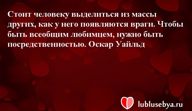 Стоит человеку выделиться из массы других, как у него появляются враги. Чтобы быть всеобщим любимцем, нужно быть посредственностью. Оскар Уайльд Копировать Цитаты. Мысли великих людей в картинках. Подборка №lublusebya-52221222042019 Источник