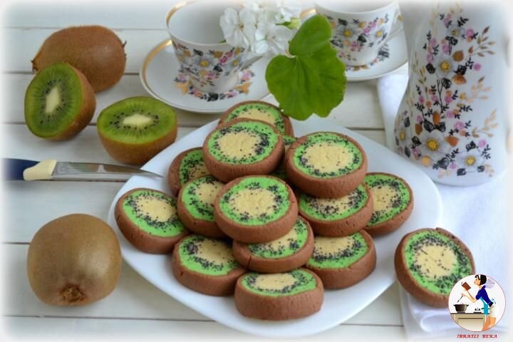 Stol ustida bunday qiziqarli, hushbo'y va mazali pechenyalarni ko'rgan bolajonlar hayratdan lol qolishlari turgan gap. Aziz bekajonlar tez tayyorlanadigan mazali pechenyalarni tayyorlagan zaxotingizdayoq ular o'z-o'zidan g'oyib bo'lish hususiyatiga ham ega. Shu sababli pechenya retseptini saqlab qolishni unutmang! Kerakli masalliqlar: Tayyorlanish usuli: 1. Yumshatilgan saryog'ni shakar kukuni bilan bir xil konsistensiya darajasigacha ko'pirtiring. 2. Tuxumni soling. Mikser yordamida ko'pirtiring. 3. Un va qirg'ichdan chiqarilgan limon po'stini solib, xamir qoring. Tayyor xamir yumshoq, cho'ziluvchan biroq, qo'lga yopishmaydigan bo'lishi lozim. 4. Xamirni 3 xil qismga bo'ling. 1-eng katta, 2-kichikroq va 3-ancha kichik hajmda. 5. Xamirning eng katta qismiga yashil rangni qo'shing, 2 qismini esa shu rangda qoldiring, 3 qismiga kakao kukunini qo'shing. Xamir ranggi bir xil tusga kirgunga qadar yaxshilab aralashtiring. So'ng, xamir bo'laklarini muzlatgich muzxonasiga 5 daqiqaga qo'ying.