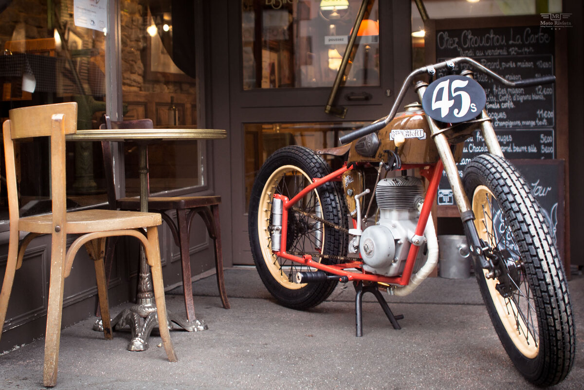 Им удалось модернизировать традиционный мотоцикл, произведенный французскими изготовителями, в оригинальным байк. Модель была намеренно покрашена в цвет серый металлик. D45 1950 оснащен большой резиной, низким седлом и боард-трекерским рулем, механики воссоздали традиционную олдскульную эмблему. Представленные детальные фотографии модели были сделаны во французском винном баре, сдержанный интерьер которого стал идеальным дополнением к байкам.