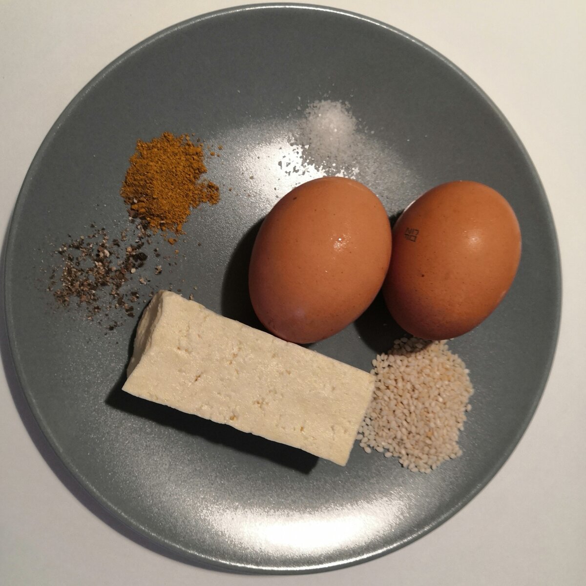 Мы готовились к отпуску и доедали остатки запасов из холодильника. Нужно было приготовиться что то сытное, содержащее белок и очень быстрое в приготовлении. Ингредиенты на 1 порцию: Яйца- 2 шт. Сыр тофу- 50 гр. Можно взять адыгейский сыр. Порошок карри-1/2 чайной ложки Кунжут- 1 чайная ложка Соль- 1 щепотка Перец черный- 1 щепотка Масло для жарки Ещё вам понадобится сковорода среднего размера, желательно с антипригарным покрытием и лопатка для смешивания яиц в сковороде. Сыр нарежьте произвольно. У меня получилось кубиками примерно 1 см. В нагретую с маслом сковороду кидаете сыр, специи и немного соли. Жарьте минут 5 иногда помешивая. Сыр должен немного зарумяниться, специи при нагревании раскроют свой вкус. Далее, разбиваем к сыру яйца, подсаливаем, берем деревянную или пластиковую лопатку и мешаем яйца прямо в сковороде. Это займет ещё пару минут. Готовим на "большом огне". В конце кидаем в жарку кунжут и жарим ещё минутку и готово. Всё так просто, быстро, вкусно и с фантазией.