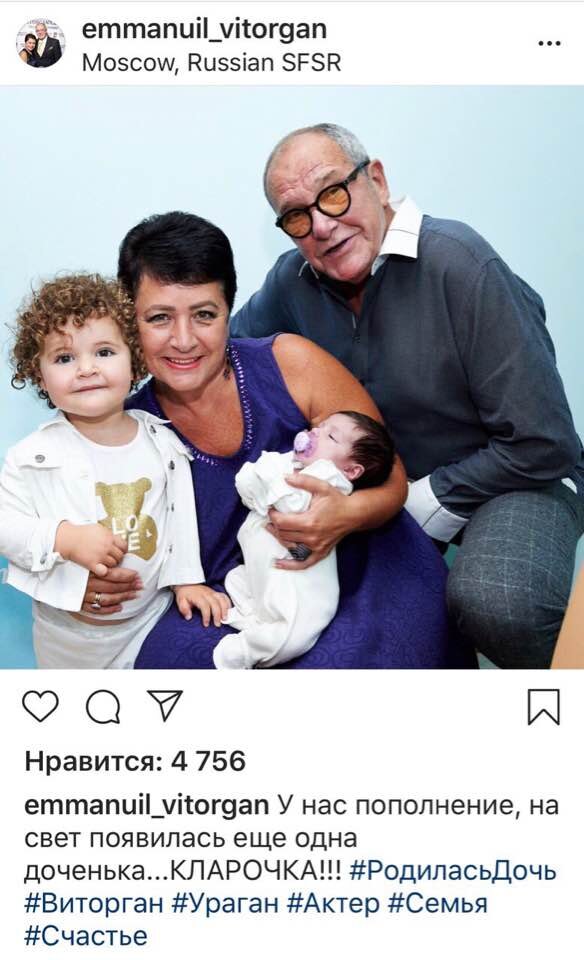 В конце прошлого века, когда я рожала свою дочку, старородящими считались женщины после 27 лет. Времена меняются. Все больше девушек сначала строят карьеру, а потом уже семью и «заводят» детей. Фу! Слово то какое….. заводят. Как домашнее животное, как игрушку. Никогда не интересовалась историями из жизни актеров и других знаменитостей. Но эта фотография из Instagram Эммануила Виторгана уже глаза намозолила. Восхищение во всех социальных сетях — какой молодец, мужчина. Оставим домыслы о том, на сколько Эммануил Гедеонович причастен к рождению этой дочери. Он в великолепной физической форме. Почему бы и нет. И все бы ничего… но «мамочке» девочки скоро стукнет 58 лет. Это ее вторые роды. Первые были в 56. Хоть убейте, не могу разделить всеобщее восхищение. Не буду даже напоминать о том, что по статистике риск рождения ребенка с болезнью Дауна увеличивается в 10 раз, если маме больше 40. Речь не только о здоровье. Ребенка мало родить, его надо вырастить и воспитать. Это мое мнение. Я ос