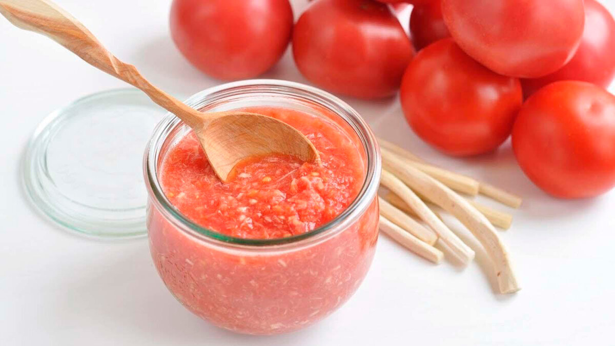 3 кг зрелых помидоров, вместо помидоров можно взять банку томатной пасты весом 400 гр. без консервантов и модифицированного крахмала 1 кг корней хрена 1 кг перца сладкого болгарского 200 гр. растительного масла 200 гр. сахарного песку 1 ст . ложку соли 100 гр. 9,0% уксуса Пряности по вкусу