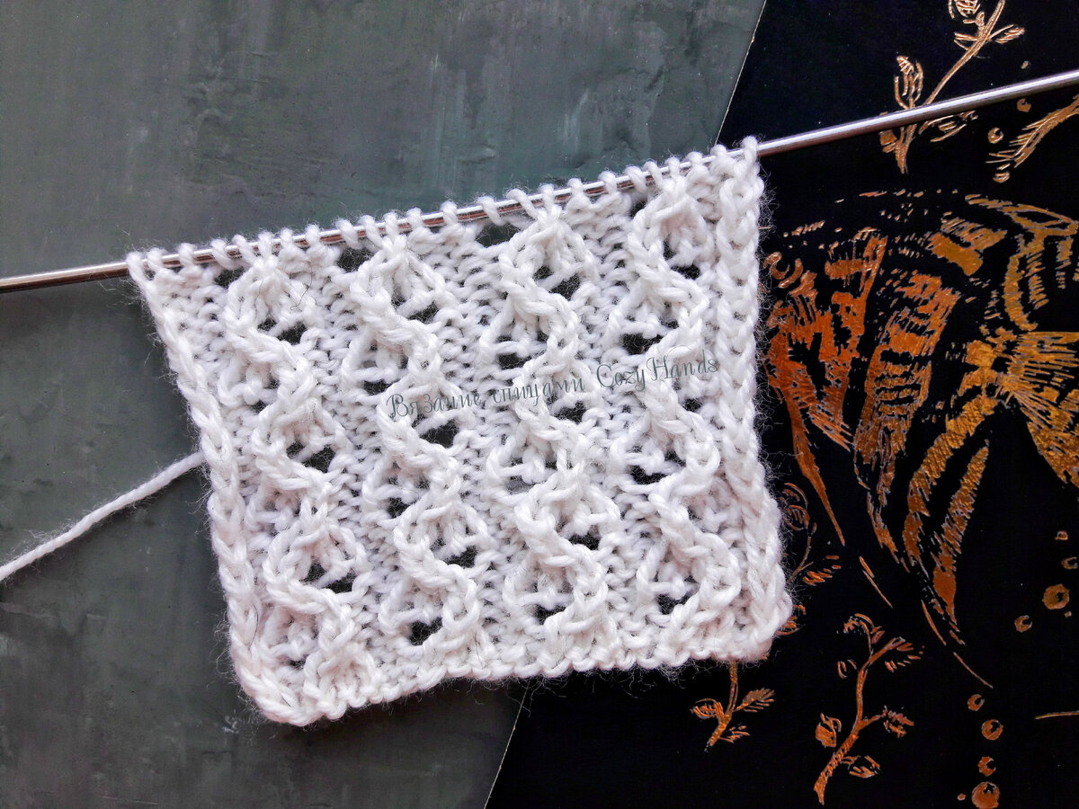 Узор выглядит в виде вертикальных волн с ажурными элементами. Отдельные элементы данного узора можно использовать в качестве декоративных дорожек в сочетании с другими узорами, создавая более сложный декор вязаного изделия. Такие ажурные волны смогут украсить любые изделия: от пледа до кардигана. Раппорт узора состоит из 5 петель, 8 рядов в высоту. Количество петель: 5 петель умножаем на количество раппортов, плюс 2 петли для симметрии, плюс 2 кромочные петли. Описание узора для поворотного вязания: 1 ряд: кром.п., * 2 изн.п., 3 лиц.п., * 2 изн.п., кром.п. 2 ряд: кром.п., * 2 лиц.п., 3 изн.п., * 2 лиц.п., кром.п. 3 ряд: кром.п., * 2 изн.п., 1 накид, 3 п. провязать вместе лиц.п. с наклоном влево, * 2 изн.п., кром.п. 4 ряд: кром.п., * 2 лиц.п., 1 изн.п., 1 накид, 1 изн.п., * 2 лиц.п., кром.п. 5 ряд: кром.п., * 2 изн.п., 3 лиц.п., * 2 изн.п., кром.п. 6 ряд: кром.п., * 2 лиц.п., 3 изн.п., * 2 лиц.п., кром.п. 7 ряд: кром.п., * 2 изн.п., 3 п. провязать вместе лиц.п. с наклоном вправо, 1 н