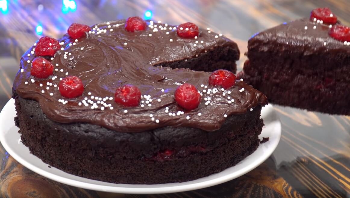 Привет друзья, сегодня хочу предложить рецепт самого бюджетного,простого и очень вкусного шоколадного пирога, готовится он из самых простых продуктов а результат получается просто шикарным. Ингредиенты: Тесто: 180 гр. сахара 190 гр. пшеничной муки 30 гр. какао-порошка (3 ст.л.) 60 гр. растительного масла (75 мл.) 240 мл. воды (комн. t) 7 гр. пищевой соды (1 ч.л.) 1 ст.л. уксуса (6-9%) 1/3 ч.л. соли Ваниль Прослойка: 2 ст.л. кислых ягод/джема и т.д. (у меня клюква) Шоколадная помадка: 20 гр. какао-порошка (2 ст.л.) 50 гр. молока (4 ст.л.) 60 гр. сахара (3 ст.л.) 40 гр. сливочного масла тесто готовится очень быстро буквально за пару минут поэтому духовку включаем сразу разогреваться на 180 градусов, в миске смешиваем сахар,муку, какао, соль,ванилин и сода, перемешиваем и просеиваем к сахару и хорошенечко перемешиваем,добавляем растительное масло, воду и хорошо перемешиваем, чтобы не было комочков, в конце добавляем уксус и ещё раз перемешиваем, сразу же переливаем его в форму испол