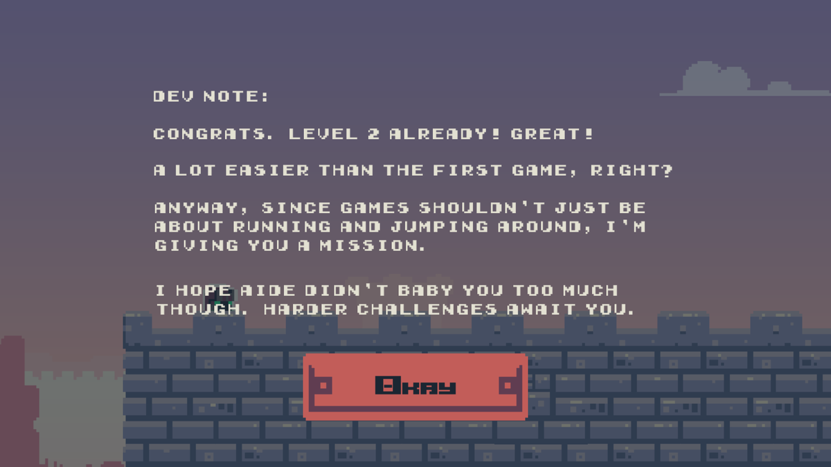 Дословный перевод: <<Поздравляю. Ты на втором уровне! Круто! Легче чем в первой части, неправдали? Не важно, эта игра не просто платформер. И сейчас, я дума тебе задание Я надеюсь А.И.Д не будет себя вести как ребенок. Сложный испытания тебя ждут>> <<Тебе нужно найти вот эту принцессу. Ее зовут Майлэс. Она была захвачена злым объектом, по имени Янна.>> А.И.Д желает нам удачи и говорит что будет с нами. Ну что ж, полетели. Пока что выглядит всё жутковато, но мне нравится как 2д платформер комбинируется с аниме. Жутковатый уровень. Какие-то монстрики которые попались на шипы. Основная проблема которая пошла и сложность уровня, это длинные прыжки через всю карту ;( Далее надо было вновь изощренно прыгать, для увиливания от монеток Но, в целом это все проходится в 3-4 ретрая, хоть и конечно не просто Разраб: Я планировал создать эту игру еще в 1999 году. Я так рад, что наконец смог это сделать Я искренне за тебя рад, игра вышла крутой и с хорошей атмосферой. А так, мы уже прошли всю сложну