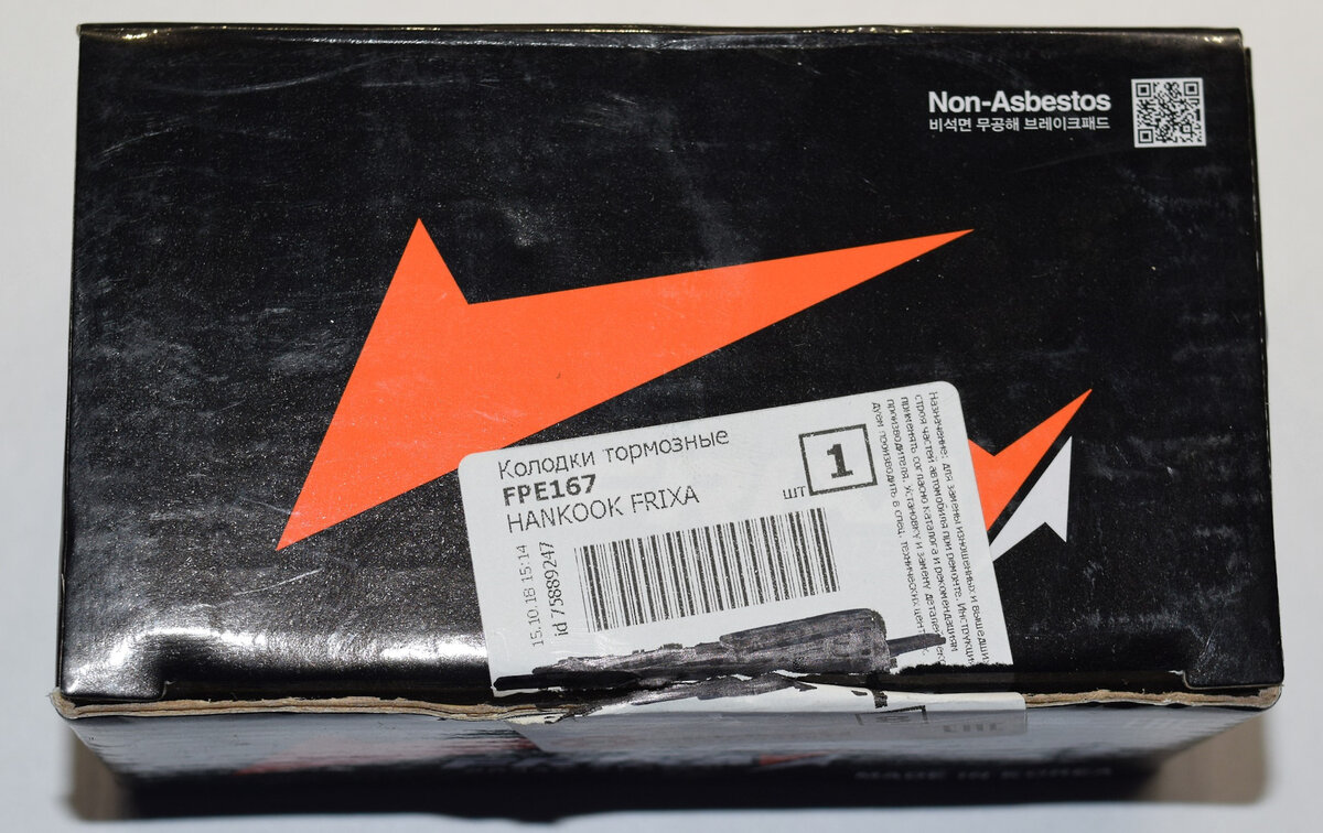 После 2,5лет скончались колодки Masuma, которые жутко пылили (передние диски колеса были постоянно черными), но тем не менее исправно и цепко тормозили без лишнего шума и главное — вообще не ели диски. На их замену решено было взять случайно попавшиеся на глаза Hankook FRIXA по цене около 600р за комплект. Колодки за свою цену удивили приятным качеством изготовления, отсутствием металла и асбеста в фрикционах и … жуткой вонью тухлой рыбы. Коробка глянцевая, в иероглифах, с рекламой что FRIXA это HANKOOK. Колодки немного меньше самой коробки — болтаются внутри, нехорошо… Колодки как колодки, покраска аккуратная, местами немного поцарапана. Фрикционы ровные, с вырезом посередине, без крупных сколов, ооочень вонючие… В наличии имеются пискуны, которые расположены кончиком слишком близко к основанию. В целом колодки на вид нормальные, посмотрим как себя покажут. Надеюсь будут не хуже Masuma.