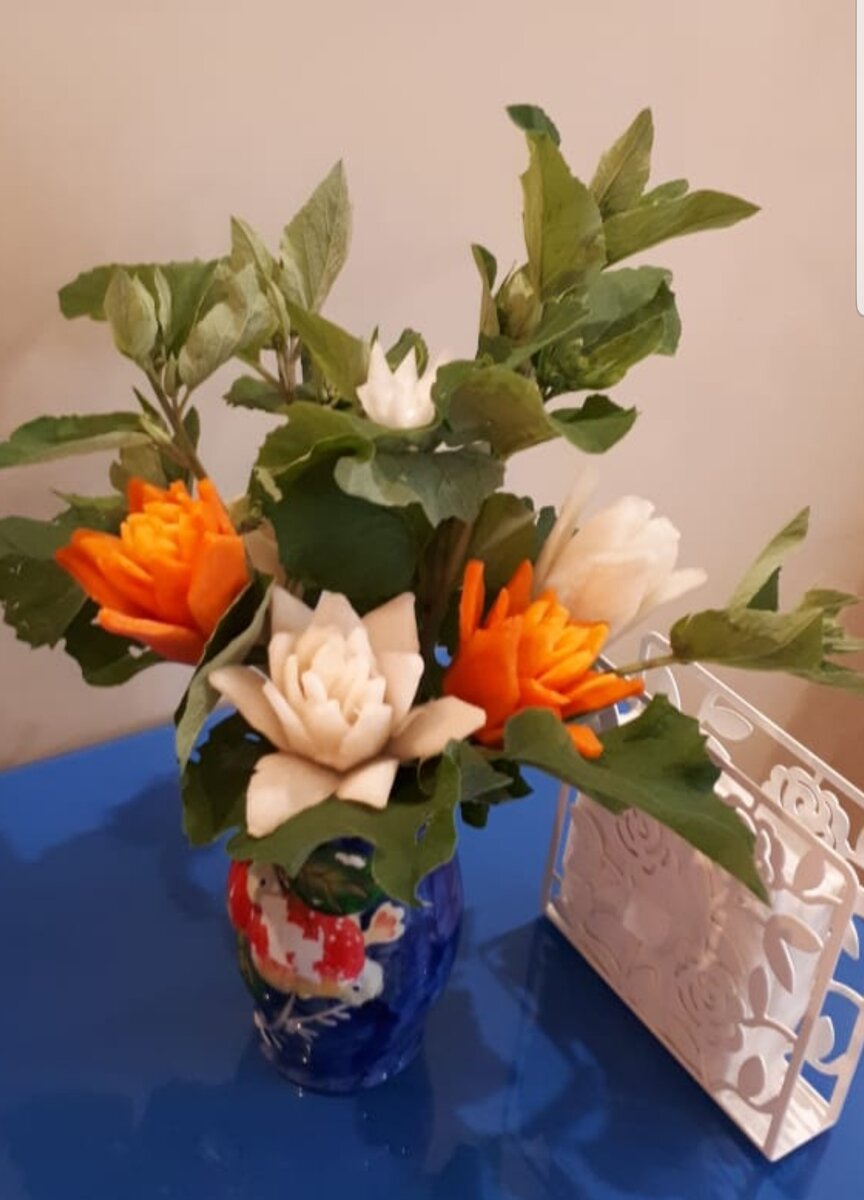Блюдо можно украсить цветами из огурца и зеленью петрушки. А на стол для украшения мы ставим цветы, вырезанные из овощей.