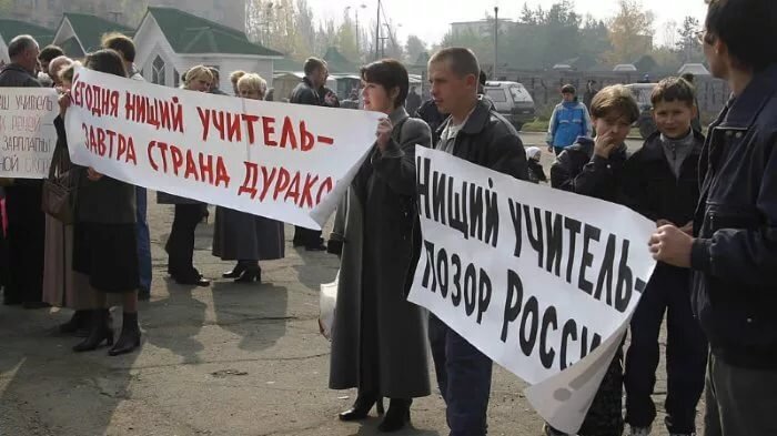 1 сентября - день знаний. По традиции - праздник, торжественная линейка, цветы. Но в 1990-е годы десяткам тысяч учителей по всей России было не до праздника. Им было нечего есть и нечем кормить семью. 1 сентября 1999 года на станицах «МК» вышла короткая заметка под заголовком «Здравствуй, школа - Новый год!», где говорилось о том, что к началу учебного года в России почти полностью перестали покупать цветы. У людей просто не было денег купить букет цветов для учительниц в начале учебного года. У кого были дачи - срезали цветы там на весь класс. Газеты тех лет пестрили заголовками о нищенском существовании учителей. Учителя в 90-е годы, как и пенсионеры, оказались самой социально незащищенной группой населения. Очень многие ушли из профессии, и российская школа навсегда потеряла свои лучшие кадры. Женщины уходили в торговлю - становились за прилавки на рынки и в магазины, чтобы прокормить свои семьи. Часть бывших учителей подалась в челноки. Некоторые уехали за границу, где стали нян