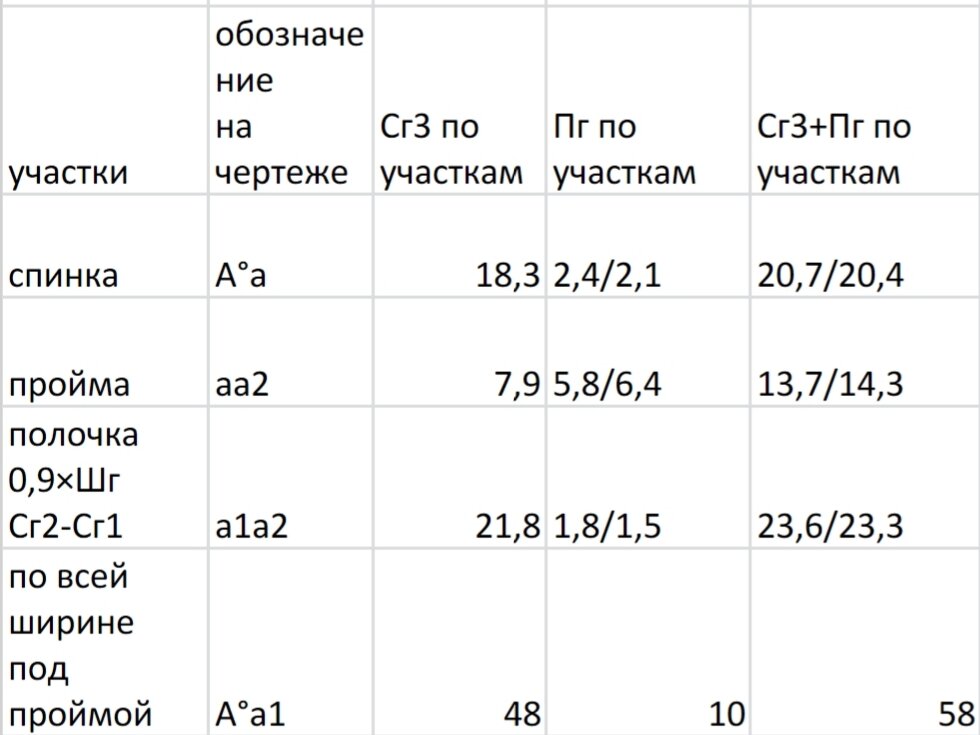 Базовая конструкция- далее буду называть БК. Всё построение будет в масштабе 1:4 Расчет построения БК 164-96-104 ● Размерные признаки: Р- 164 Сш- 18,5 Сг1- 45,9 Сг2- 50,4 Сг3- 48 Ст- 38 Сб-52 Шг- 17,3 Дтс2- 42,9 Дтп2-44,4 Вг- 27 Впрз2- 21,5 Впк2- 43,2 Шс- 18,3 Шп- 17,3 Оп- 30,3 Дизд- 90 Др- 60 ● Выбор прибавок: Пг- 10 Пт- 8 Пб- 7 ● Прибавки общего значения Пп- 1,8 Пс- 2,4 Пдтс- 1 Пспр- 3,5 Пшгс- 1,5 Пвгс- 0,4 ПОп- 11,7 Пгор- по модели ● Дополнительные: Ппл (прибавка на подплечник, может быть, а может и не быть, по модели) Пур (прибавка на уработку) ● Таблица предварительного расчета: Расчет таблицы начинается снизу- подставляем все имеющиеся данные. Делаем анализ ширины проймы с минимальным значением из таблицы. Минимальное значение проймы для 48 размера по таблице 14,1. В нашем случае необходимо сделать корректировку проймы за счет уменьшения прибавок Пп, Пс, увеличивается прибавка к ширине проймы 14,3. Чтобы не делать корректировку проймы на практике берут % распределение Пг по учас