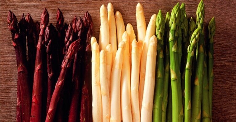 Польза спаржи заключается в содержании витаминов A, B1, B2, B3, B5, B6, B9, C, E, K и PP. Зелёный сорт овоща содержит в себе больше витаминов, чем белый.