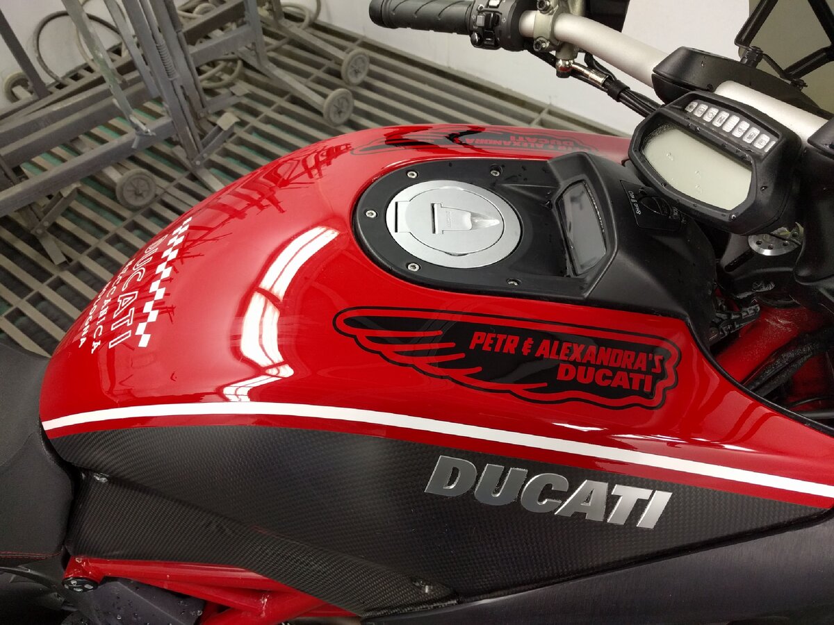 Кузовпорт – это место, где можно навести шик любой колесной технике: наши мастера с одинаковой любовью и ответственностью «колдуют» и над автомобилями, и над мотоциклами. Однажды им в руки попал байк Ducati Diavel, довольно редкая птица на российских просторах. Легкий и мощный, эргономичный, стильный – он никого не оставлял равнодушным. Чувствовалось, что сам владелец этого красавца без ума от него, поэтому задачу мастерам поставил четко: не просто покрасить мотоцикл, а сделать его уникальным и неповторимым. При этом изменения не должны нарушать классического стиля байка, в общем, недопустимы никакие «бантики» и «финтифлюшки». Было решено взять за основу исторические мотивы легендарной марки Ducati – фраза Ducati Meccanica Bologna в оригинальном начертании легла в основу логотипа на нижней части бака, ее дополнили неповторимыми «шашечками». Этот логотип изготовили из плотной самоклеящейся плёнки, что позволило получить приятный рельеф. На верхней части боковых поверхностей бака появил