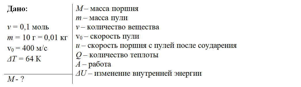 Полное условие задачи В вакууме закреплен горизонтальный цилиндр с поршнем. В цилиндре находится 0,1 моль гелия. Поршень удерживается упорами и может скользить влево вдоль стенок цилиндра без трения. В поршень попадает пуля массой 10 г, летящая горизонтально со скоростью 400 м/с, и застревает в нем. Температура гелия в момент остановки поршня в крайнем левом положении возрастает на 64 К. Какова масса поршня? Считать, что за время движения поршня газ не успевает обменяться теплом с поршнем и цилиндром. Краткое условие задачи Решение задачи Гелий в цилиндре можно рассматривать как идеальный газ. Запишем формулу изменения внутренней энергии для идеального газа: Гелий одноатомный газ, поэтому число степеней свободы i = 3. С учетом этого получим: Изменение внутренней энергии, в соответствии с первым началом термодинамики, пропорционально количеству теплоты, подведенной к газу Q и работе A силы давления поршня, сжимающего газ: В задаче теплообменом пренебрегают, поэтому: При движении поршня