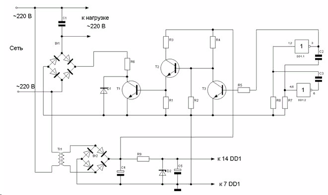 Главные составляющие элементы прибора: выпрямитель, емкость, транзистор. Конденсатор подключен по последовательной цепи с выпрямителем, когда выпрямитель производит работу на транзистор, заряжается в данный момент времени до размера напряжения линии питания.