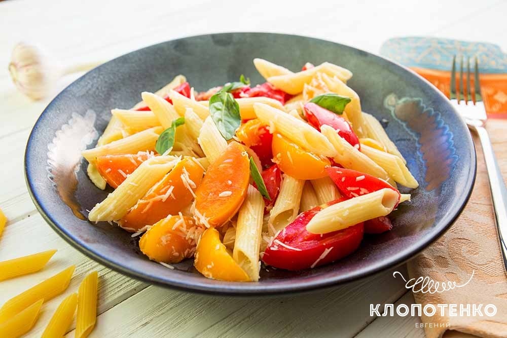 Ингредиенты ПАСТА С ТОМАТАМИ И ЧЕСНОКОМ: пошаговый рецепт 1. Отварите 250 г макарон пенне в 2, 5 л воды с 1 ст. л. соли в течение времени, указанного на упаковке. Запомните, идеальное сочетание для варки любых макарон: на 100 г макарон 1 литр воды и 10 г соли. 2. Пока варятся макароны, порежьте два томаты небольшими кусочками. Используйте томаты разных цветов, поверьте, так будет вкуснее. 3. Несколько зубчиков чеснока очистите и мелко порежьте. Вы можете использовать и один зубчик, чтобы вкус был нежным. 4. В небольшой миске смешайте помидоры, чеснок и готовые макароны. 5. Потрите в миску 30 г пармезана и перемешайте. Если необходимо, добавьте соль и перец по вкусу. 6. Разложите пасту по глубоким тарелкам. Добавьте в каждую тарелку по 1 ст. л оливкового масла и несколько листочков базилика. Готовить - это просто!