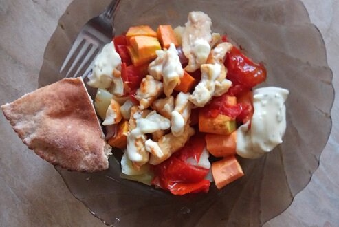 Вычитала рецепт этого салата в одном из журналов, мне оказался интересным – запечные овощи + куриная грудка, благо все ингредиенты были в наличии, поэтому решила его сразу приготовить, не откладывая на потом, пока морковка еще молодая.