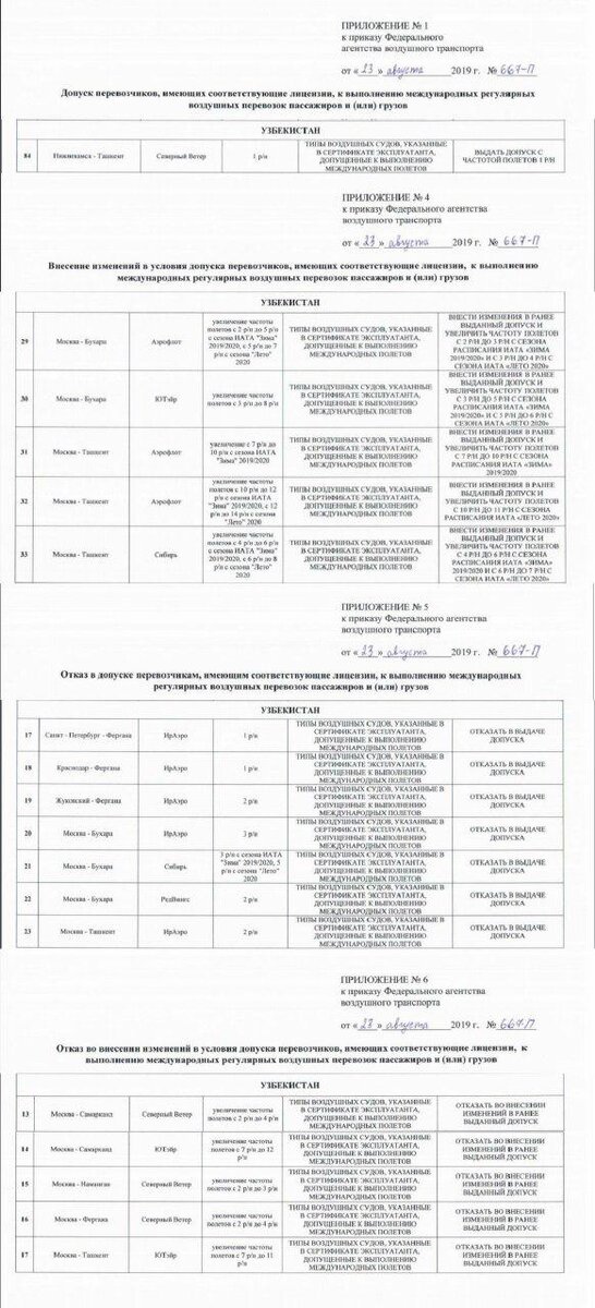 Новости от Росавиации, касающиеся Узбекистана, о допусках, внесениях изменений в условия допусков перевозчиков к выполнению международных перевозок от 23 августа 2019 года: - C зимнего сезона будет открыт рейс Нижнекамск - Ташкент от авиакомпании Nordwind Airlines с частотой 1 раз в неделю. - Будет увеличена частота полётов по маршруту Москва - Бухара с 2 до 3 в неделю, и с 3 до 4 в неделю с летнего сезона, от авиакомпании Аэрофлот. Авиакомпании Utair по данному направлению разрешили увеличить частоту с 3 до 5 раз в неделю, и с 5 до 6 раз в неделю с летнего сезона. - Авиакомпания Аэрофлот увеличит частоту полётов по маршруту Москва - Ташкент с 7 до 10 раз в неделю, и с 10 до 11 раз в неделю с летнего сезона. S7 Airlines по данному направлению увеличивает частоту с 4 до 6 раз в неделю, и с 6 до 7 раз в неделю с летнего сезона. - Запросы на допуск от авиакомпании ИрАэро по направлениям из Ферганы в Жуковский, Краснодар, Санкт-Петербург, а также на рейсы из Москвы в Ташкент и Бухару