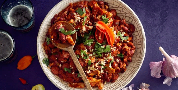 Аля "Чили кон карне" Блюдо мексиканской кухни, мы делаем вариацию на него из мяса курицы взятого с ножек. Оно островато, но я люблю его именно за это: Сначала на разогретой сковороде обжариваем колбаски, из них выйдет жир на котором приготовьте лук и чеснок. Затем вынимаем и в том же масле-жире готовим курицу, порезанную на небольшие кусочки. Оставшиеся ингредиенты выкладываем и тушим минут 10, Затем открываем и выпариваем лишнюю воду. Украшаем зеленью кинзы или укропа.