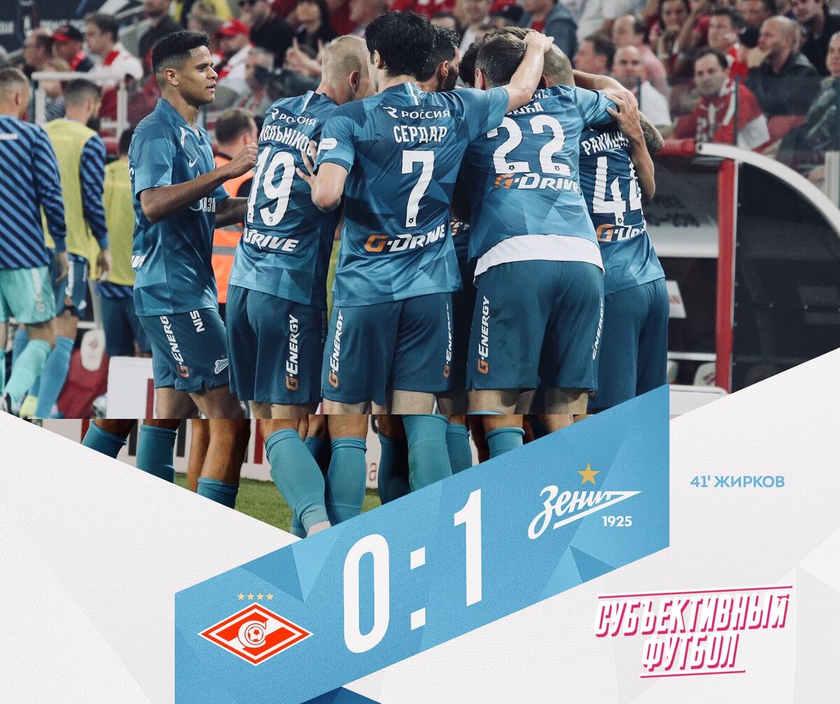 Сергей Семак впервые в роли тренера переиграл «Спартак», причём это было абсолютно заслуженно. Было видно, что «Зенит» лучше и серьезнее подготовился к сопернику, нежели «Спартак», который вылетел из Лиги Европы от «Браги» и имел намного меньше времени. С самого начала встречи было видно, что играют две топ-команды РПЛ: отличные скорости, мастерские передачи игроков, огромное количество ударов по воротам. В первой части первого тайма преимущество больше находилось на стороне «Спартака» и на 32’ Бакаев забил гол, но подыграл себе рукой во время приема мяча, поэтому, посмотрев ВАР, судья отменил гол. Этот момент сильно деморализовал москвичей и «Зенит» начал давить по всем фронтам, чаще всего по центру поля, который у «Спартака» постоянно проваливался. На 42-ой минуте 36-летний Юрий Жирков вспомнил, как любит забивать красивые мячи в ворота «Спартака» и положил шикарный мяч в ворота Максименко! Такие мячи не берутся! Юра - легенда! Не зря получил вызов в сборную России. Жирков - 1