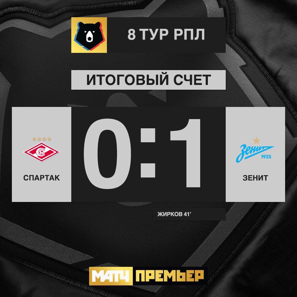 Московский Спартак уступил дома Зениту , единственный гол забил 36-й летний Юрий Жирков ударом за пределами штрафной, мяч красиво залетел в сетку ворот. Спартак так и не смог ответить не чем , ещё раз доказывая что игроков набрали сильных , а команды так и нету , наверно пахнет отставкой Кононова. Артем Дзюба: «В прошлом году «Спартак» два раза отскочил от нас, в этом — нет» Недавно закончился матч в Мадриде , где походу игры , Атлетико проигрывал в 2 мяча , но матрасники смогли отыграться и даже вырвать победу в конце матча , после удачных отскоков мяч вернулся к Томасу Партею и тот одним касанием принёс победу и Атлетико возглавил таблицу в Ла Лиге.
