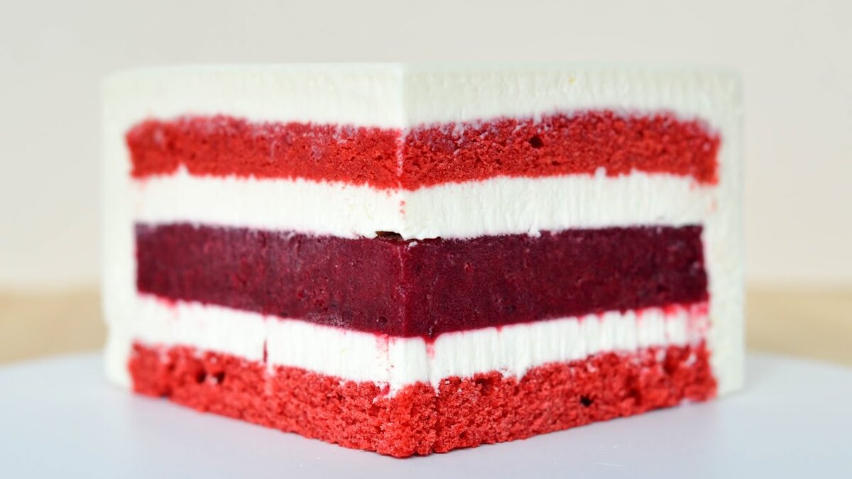 Ингредиенты : Мука 350 гр Сахар 300 гр Какао алкализованное- 5 гр Соль 1/4 ч.л. Разрыхлитель 5гр Сода 3 гр Яйца 3 шт Растительное масло 300 гр Пахта(кефир) 280 гр Гелевый Краситель красный Приготовление: Духовку разогреваем до 175-180 градусов в режиме верх-низ. Форму смазываем сливочным маслом(бока), дно застилаем пергаментом . Засыпаем в чашу миксера все сухие ингредиенты, какао лучше брать алкализованное (продаётся в любом магазине в маленьких пакетах, например dr. Otker), потому что оно ярче по вкусу и его не надо сыпать полкило в тесто(а это важно, тк надо сохранить красный цвет бисквита ). Затем добавляем яйца, масло и пахту(продаётся в больших магазинах в отделах кисломолочной продукции). Если нет пахты , то можно заменить кефиром от 3% и выше. Добавляем краситель. Если гелевый, то около 2 чл, жидкий 2-2,5 ст.л, но все это зависит от марки красителя . Затем замешиваем миксером тесто, получается оно более жидкое , чем на обычный бисквит. Оставляем тесто в деже мин на 5. Тем в