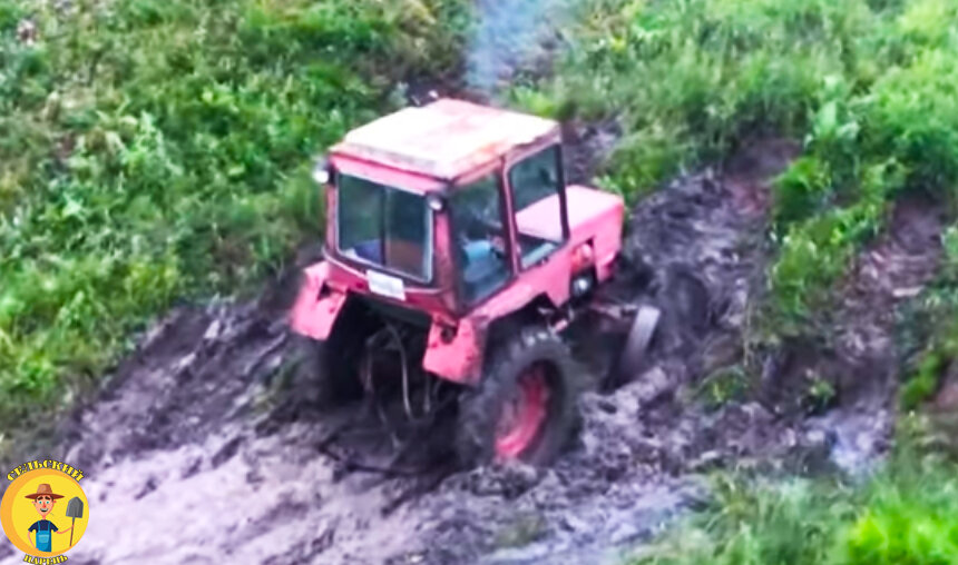 Следующий день. Прибыли на место. Начинал Саня, на своём тракторе. Сразу же преодолел первую грязь и небольшую лужу. Основная задача была взобраться на пригорок, который тоже был в жиже.