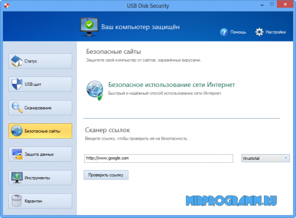 USB Disk Security скачать бесплатно USB Disk Security – полезный софт для сканирования и очистки вредоносного материала на съемных носителях. Защищает системные ресурсы от угроз внешних носителей, восстанавливает поврежденный материал, проверяет сайты на вирусные ПО и очищает временные файлы. Имеет понятное русскоязычное меню. Утилита сканирует карты памяти, жесткие диски и другие носители, выявляет возможный вред ПК, удаляет вредоносное содержимое или переносит его в карантин. Также исключает неразрешенное копирование информации, проверяет подключаемые носители и круглосуточно обороняет персональный компьютер. Последняя версия проги совместима с различными антивирусными продуктами и не вызывает конфликтов с ними. Пользователь может отслеживать угрозы в реальном времени с помощью usb-щита, безопасно веб-сёрфить и защищать свои данные. Предлагаем usb disk security скачать бесплатно русская версия и оценить возможности качественного продукта. Рассмотрите аналогичные