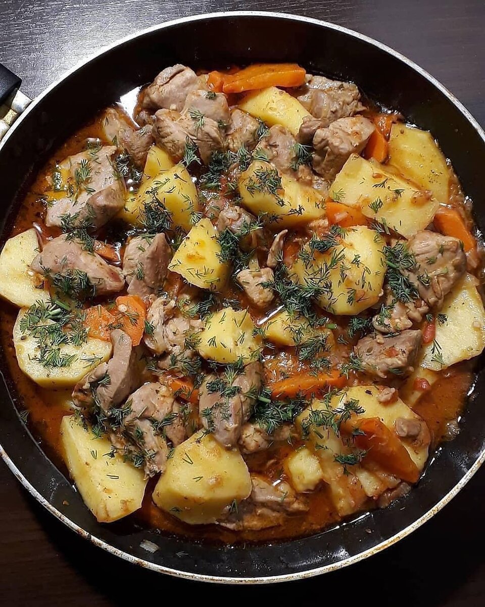 Жаркое из индейки с картошкой - 🥘сытная и простая домашняя классика, Это самый удобный и быстрый способ правильно подрумянить и не разварить картофель, сохранить индейке сочность, и избежать большого количества грязной посуды, поскольку блюдо готовится в одной сковороде.😉 . Ингредиенты; Индейка -500гр Лук -2шт Морковь -1шт Помидор -2шт Картофель -3шт Растительное масло -100мл Кавказская приправа Соль по вкусу Бульон или простая вода -50мл Срезанное с кости мясо жарьте 5-7 минут. Добавьте лук и морковь. Через 5 минут - помидор и картофель жарим еще 7-10минут. Далее добавьте спецы, соль, воду и потомите 15 минут. Жаркое посыпьте зеленью и подайте к столу.