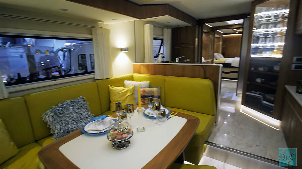 Вы когда-нибудь задумывались о том, что можно купить за 1,5 млн евро? Да сейчас можно купить все что угодно, лишь бы карман не был дырявым и деньги туда сыпались со скоростью звука. За 1,5 млн евро или же за 110 миллионов рублей можно купить дом на колесах, в нижнем отделении которого, расположен суперкар. Это просто невероятно! Те у кого есть такие деньжища, могут позволить себе комфортабельный автобус под названием Volkner Mobil Performance S, интерьер которого, переплюнет самую дорогую пятизвездочную гостиницу. Здесь есть даже телевизор, аккуратно спрятанный в шкафчик Такой же телевизор имеется и в спальне, но об этом чуточку позже. Обеденная зона граничит с кабиной водителя. Отсюда открывается отличный вид из огромного лобового стекла. Так, к примеру можно припарковать "свой дом" на берегу тихого озера и наслаждаться вкусным обедом. Мммм, кайф! За обеденной зоной, красуется зона приготовления пищи. Здесь есть раковина, смеситель, куда подается вода из бака, с