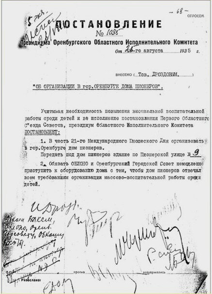 Блогер-краевед Надежда Кутафина об оренбургском Доме пионеров: «В городе Оренбурге стартовым началом развития системы дополнительного образования стало 25 АВГУСТА 1935 ГОДА, когда постановлением заседания Президиума Оренбургского Областного Исполнительного Комитета было решено открыть в городе Оренбурге Дом пионеров.